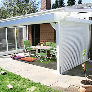 Das nennt sich geschützte Gartenlaube. Hier können Sie sehr gut die Montagevariante von außen, links auf das Mauerwerk erkennen. Der Rolltorpanzer in hell-brauner Farbe unterscheidet sich vom dunklem Kasten, den Führungsschienen sowie der Endleiste.